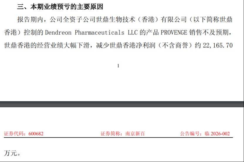 南京新百在公告中明确,全资子公司世鼎生物技术(香港)有限公司(以下简称“世鼎香港”)控制的Dendreon Pharmaceuticals LLC(以下简称“丹瑞”)产品PROVENGE销售不及预期建宝优配,导致世鼎香港经营业绩大幅下滑,减少世鼎香港净利润(不含商誉)约2.22亿元。