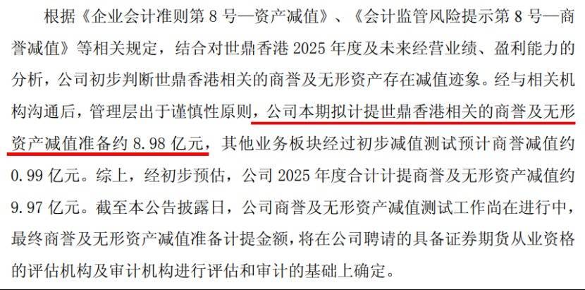 更为致命的是,基于对世鼎香港未来盈利能力的预判,公司拟计提相关商誉及无形资产减值准备约8.98亿元,叠加其他业务板块0.99亿元的商誉减值,2025年合计减值金额高达9.97亿元,成为吞噬利润的主要推手。
